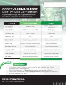 Adopting cobots doesn’t just improve performance—it pays off quickly. Businesses that implement cobots experience measurable returns through reduced labor costs, minimized downtime, and higher throughput, making automation a smart long-term investment.